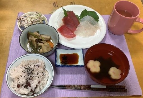 夕食には、敬老祝メニューをご提供。お赤飯にお刺身やアルコールを召し上がりました。